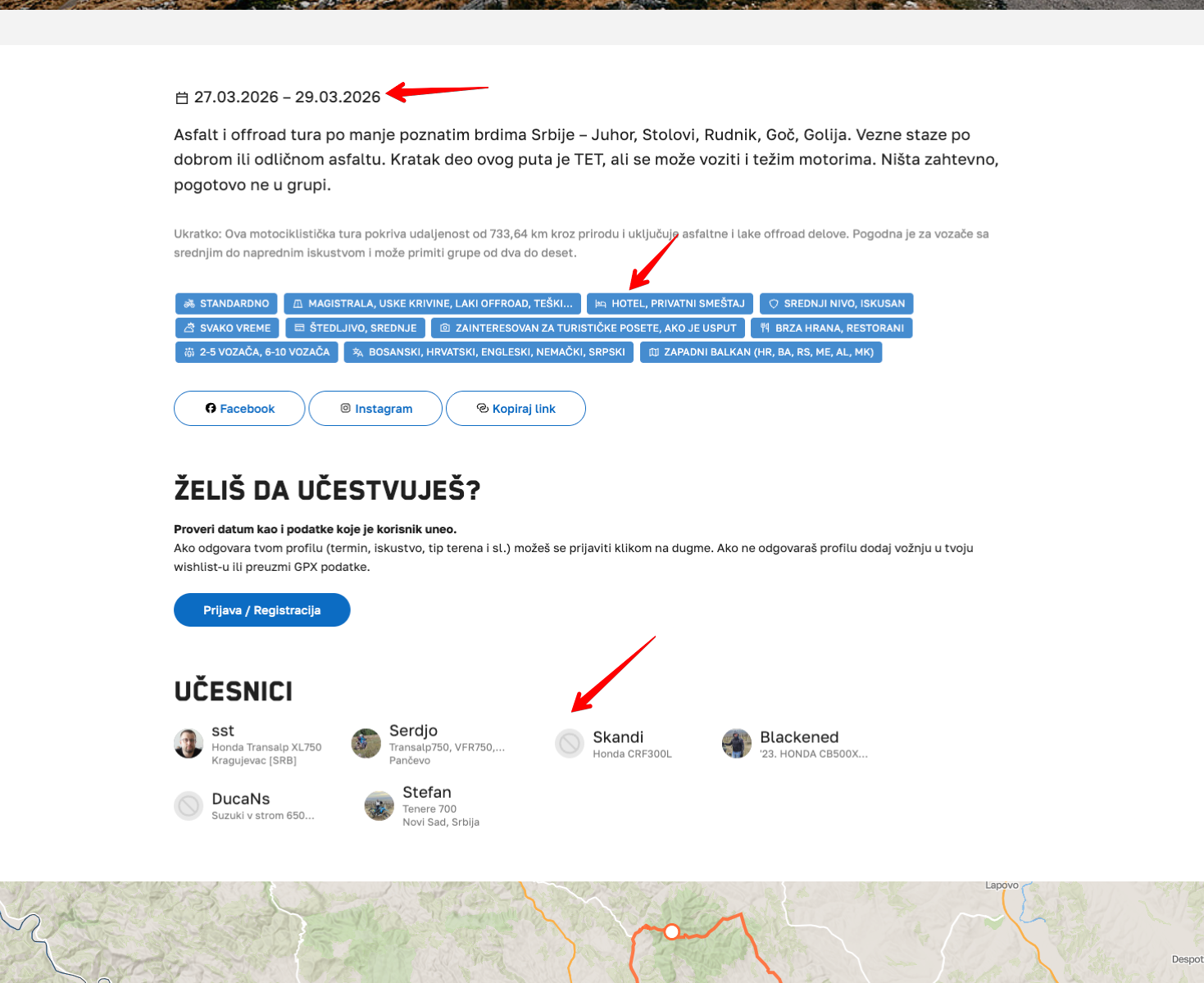 Možeš naravno – napr. na https://4ride.rs/rs/planirane-moto-ture/laki-offroad-po-srbiji Vidi se termin (ova tura ima fiksan termin, neke nemaju), osobine koje je postavio organizator i potvrđene učesnike. Prijaviš se pod "Želiš da učestvuješ", dobiješ ok od organizatora i dalje ili preko 4ride.rs ili preko Vibera i sl. Cilj je da se komunikacija objavljuje vezano za vožnju, zbog toga je potrebna potvrda od strane organizatora. Možda se već dovoljno ljudi prijavilo ili šta već. Prijava ne znači da moraš da ideš, već da si zainteresovan. Mi sada upravo raspravljamo za ovu turu kada ko može preko Vibera.