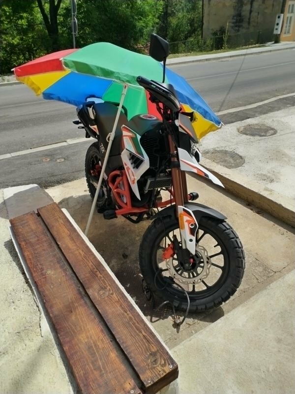 4. Aj' da se i ja pohvalim šta postavih ovih pretoplih dsna sa previše sunca na moje motorče. Imam laku "srebrnu"ceradu ali nema gde da ode vruć vazduh. Zato mali suncobran štiti a ako ima imalo vetra završen posao.