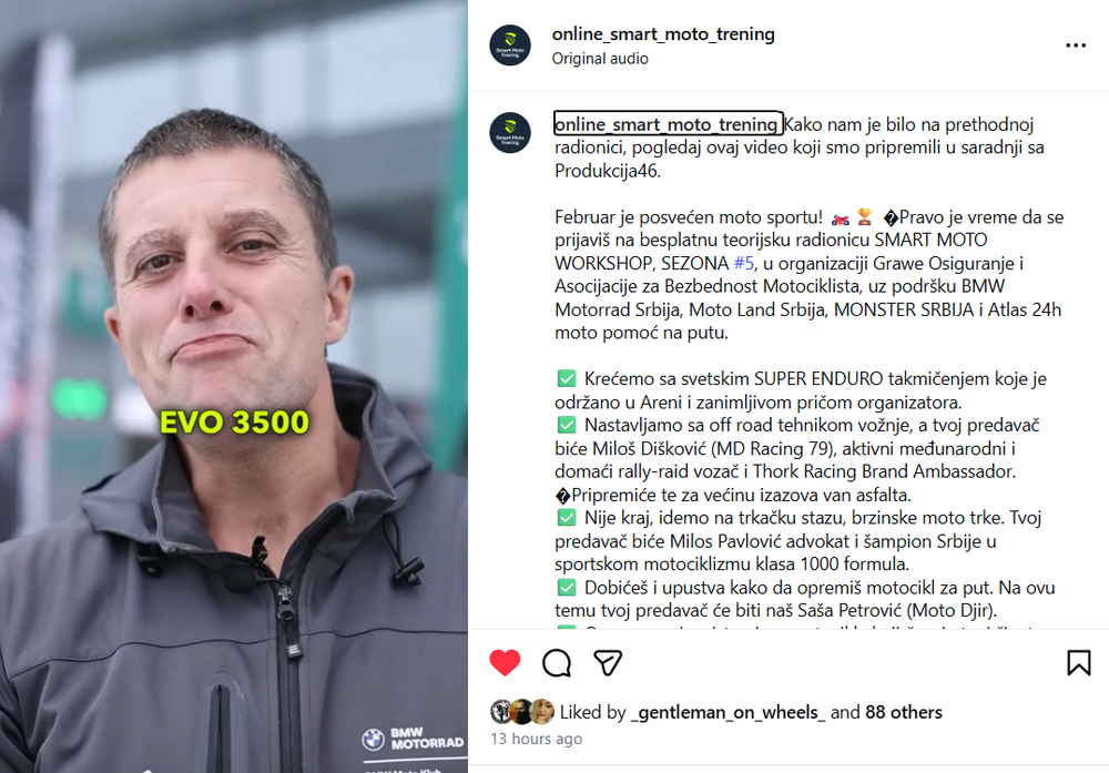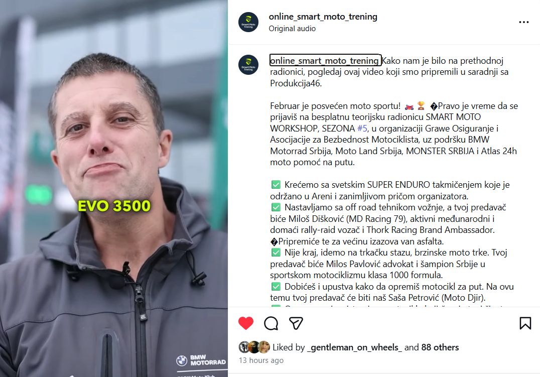 Samo da nastavim niz edukativnog sadržaja za forumaše i sve one koje interesuje ova tema. Radionica je odlično prošla, sala je bila prepuna. Za one koji su bili sprečeni da dodju kopiram link gde možete da čujete osnove ''Kako se pripremiti za Rally'' Takođe, čestitam svim dobitnicima nagrada od strane sponzora Crafter koji je omogućio zanimljive multi-tool nagrade koje možete da koristite kao deo vašeg alata za motor. Online SMART Moto Trening (@online_smart_moto_trening) • Instagram reel WWW.INSTAGRAM.COM 29 likes, 2 comments - online_smart_moto_trening on February 28, 2026: "Najbolje predavanje... SMART MOTO WORKSHOP".