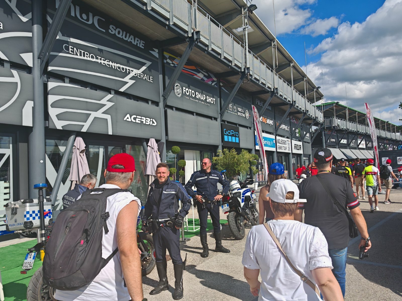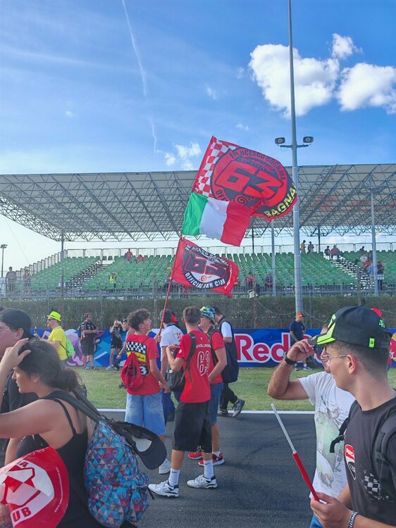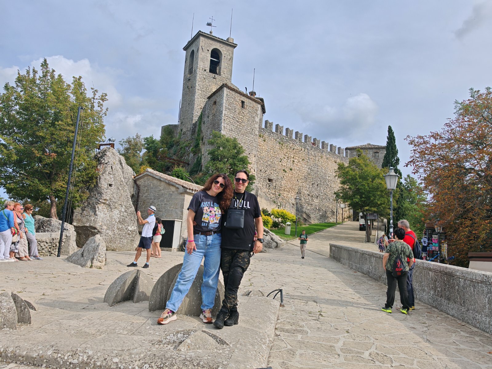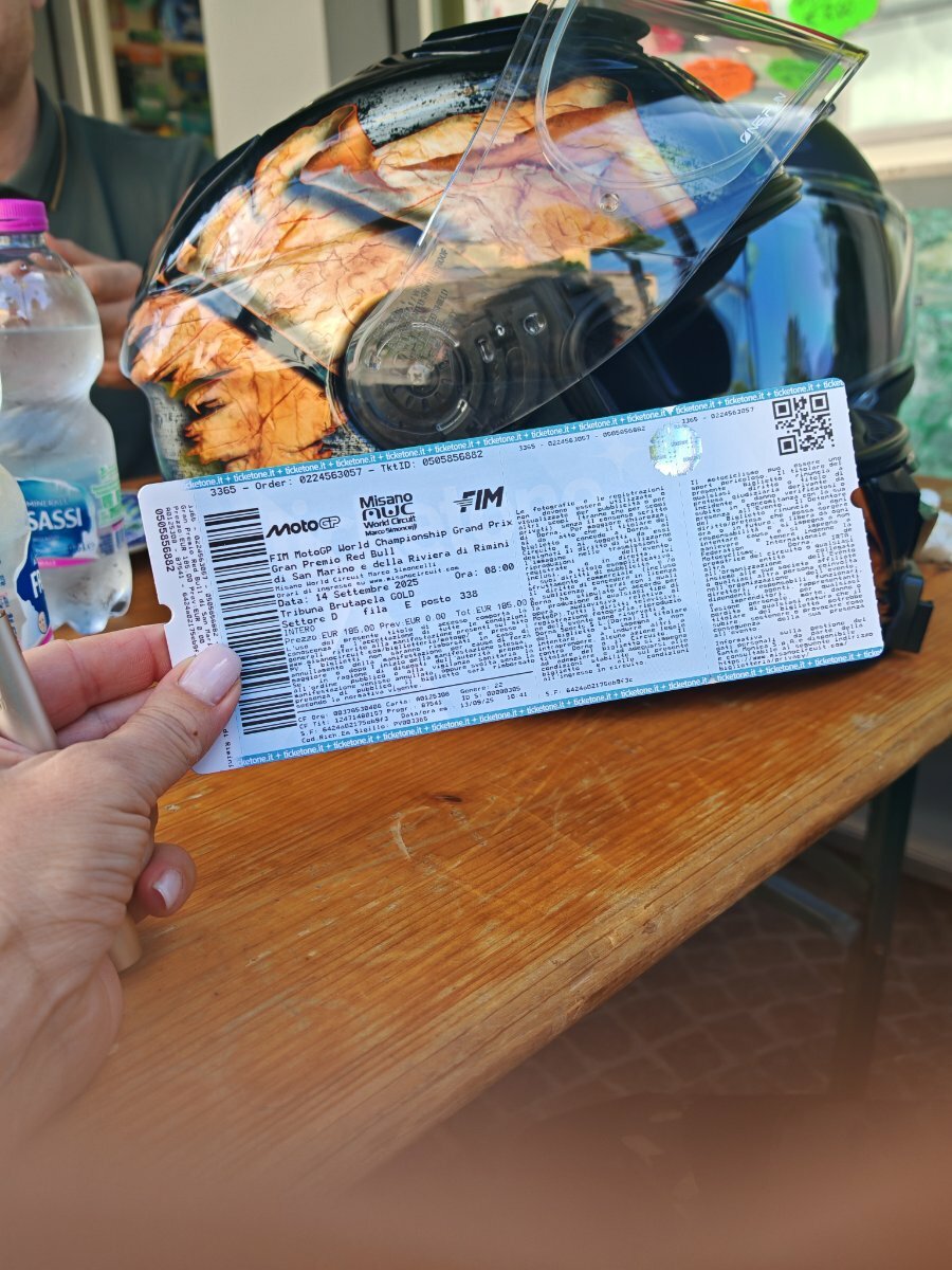 SUBOTA 13.sep. - Došao i dan kada saznajemo gledamo li GP ili ne. Ne žurimo, lagano doručak i do Mizana po karte ili možda ne . Plan za ostatak dana posetiti Tavulju, po ko zna koji put, da vidimo ima li šta novo u Tavulji i bilo je . Ženski deo ekipe je za vožnju do San Marina i razgledanje ali mi znamo šta ide uz to razgledanje, bili i prošle godine u ovo vreme. ŠOPING, Dragana nameračila da kupi patike i parfeme pa makar ih držala između nas, morao sam da popustim. Inače krenuli sa punim koferima. Stižemo i ima mesta na tribinama , odemo ja i ćera da kupimo karte i naravno uzmemo skuplju tribinu, umal nas ne roknuše kad videše cenu . Kaže Draganica koliko sam parfema mogla da kupim, nije mi oprostila do San Marina gde sam je častio parfem. Karte kupljene e sad do fan kluba VR46, gasss. Tavulja, uvek se osetim nekako lepo kad god da dođem, kao prvi put da dolazim. Uvek nešto pronađem i kupim. Dragana se ponovila sa dve majčice a ja skromno naočare, aktivni veš, kačket, nalepnice. Inače svaku trku ili ovde kupim po jednu repliku, mini, Rosijevih kaciga. Posle obilaska odlazimo preko puta da pogledamo izložene stare trkačke motore i u lokalnom kafeu da popijemo po pićence, kaficu i neke sitne kolačiće koje uvek poručimo. Mala pauza pred San Marino. Lagano vozimo i uživamo u krivinama dok se penjemo u San Marino. Neki jedva čekaju da se parkiramo i gas. Imamo sreće i nalazimo parking za motore na 20m od ulaza u stari grad. prvo sedamo na sladoled da se odmorimo za pentranje po ulicama uzbrdo. Svi prihvatamo predlog. Kad smo svi ispunili svoje planove jedna pauza uz kaficu i limun sodu, koju obožavam da pijem kad sam u Italiji . Povratak u Rimini, odlazak na večericu i sutra idemo na GP.