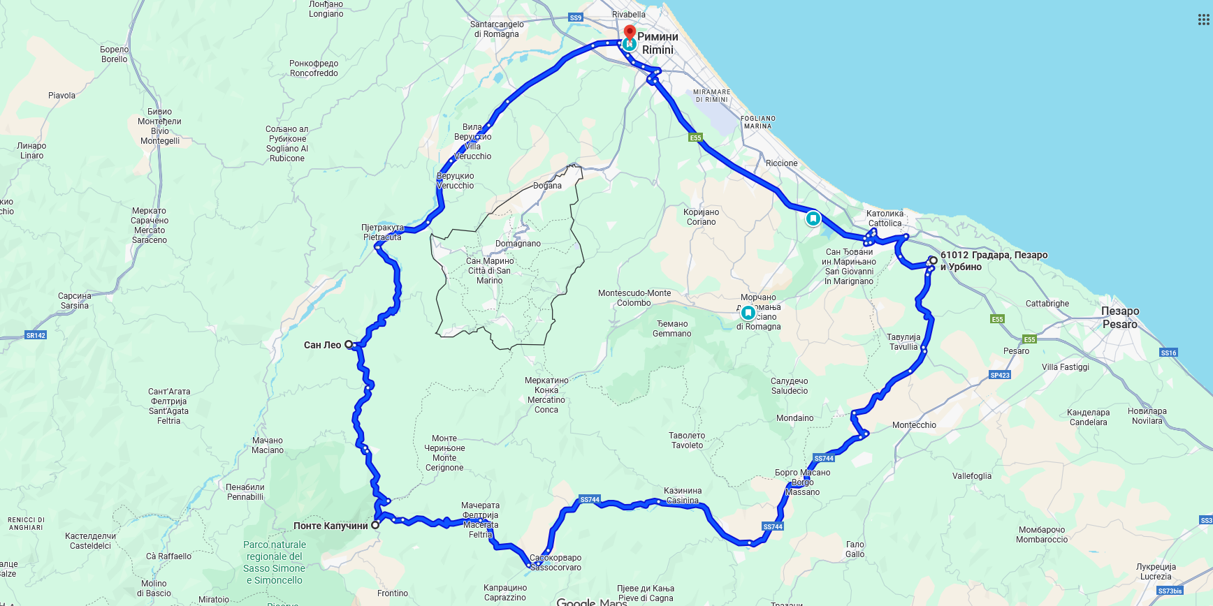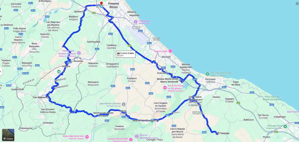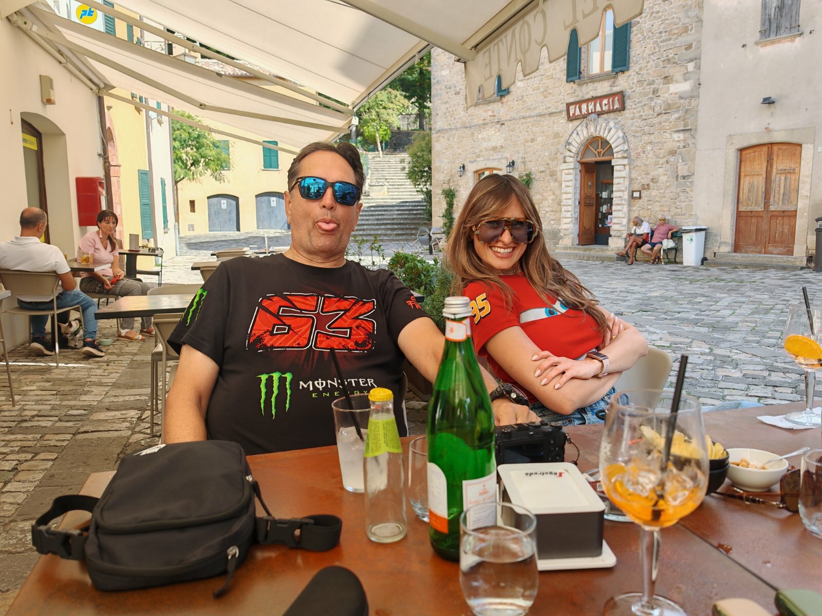 Vraćamo se sa trke, pomalo razočarani kako je prošao naš miljenik. Dobro bar je 72 osvetlao obraz i njega obožavamo kao i ceo VR tim. Odlazimo do centra da se malo prošetamo, večeramo i izdogovaramo gde sutra jer nam je poslednje veče u apartmanu. Plan je bio da odemo do Slovenije i malo se vozikamo pre povratka, tri noćenja. U restoranu ćera gleda prognozu i kaže u Sloveniji ima kiše. Svidelo nam se ovde u Riminiju a imali smo neke rute za vožnju koje nismo stigli da odvozamo. Brzo se dogovaramo da pozovemo vlasnicu i produžimo još dva dana ako nije izdala apartman. Na našu sreću nije i u to ime proslavljamo uz vino. Sledeća dva dana smo se lepo vozikali, pijuckali grickali bez nekog pritiska, čak smo još jednom skoknuli do Tavulje da kupimo još nešto ako nam je promaklo u subotu. Rute nisu bile zahtevne ali je imalo šta da se vidi i uživa u vožnji. Nismo hteli da se preterano umaramo zbog povratka kući a znamo da se ponovo vraćamo u ove krajeve da obiđemo propušteno, recimo nikako da skoknemo do Ravene a planiramo je svaki put.