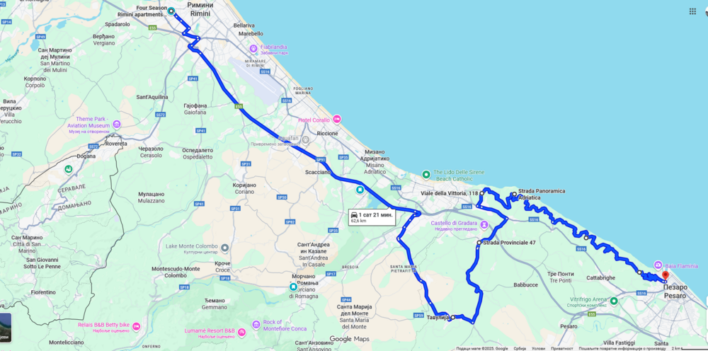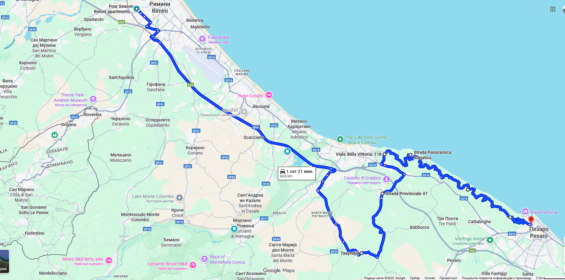 UTORAK 16 sep. - za danas planirana vožnja STRADA PANORAMICA ADRIATICA SP44. To je panoramska ruta gde skoro svo vreme vožnje imate pogled na more sa visine, vozimo do grada PESARO. Tu planiramo malo šetnje uz more, kafe pauza i povratak istom rutom ka Riminiju, jer ova deonica uz more nije nešto duga pa da je ponovimo ako nam se svidi. Ako ne,planiramo u Pesaru neku drugu rutu za povratak. Vremena imamo i previše tako da možemo danas da se malo igramo danas . Doručak i krećemo lagano, pravimo malo iznenađenje našim suvozačicama i kao slučajno prolazimo kroz Tavulju . E kad smo tu da bacimo pogled ima li šta novo u radnji VR46 . Slika sa ove vožnje nema puno jer smo slikali malo a više je radila kamera. Večeras se pakujemo i ujutro idemo ka Sloveniji i tu odmaramo jedan dam pa lagano ka Zemunu.