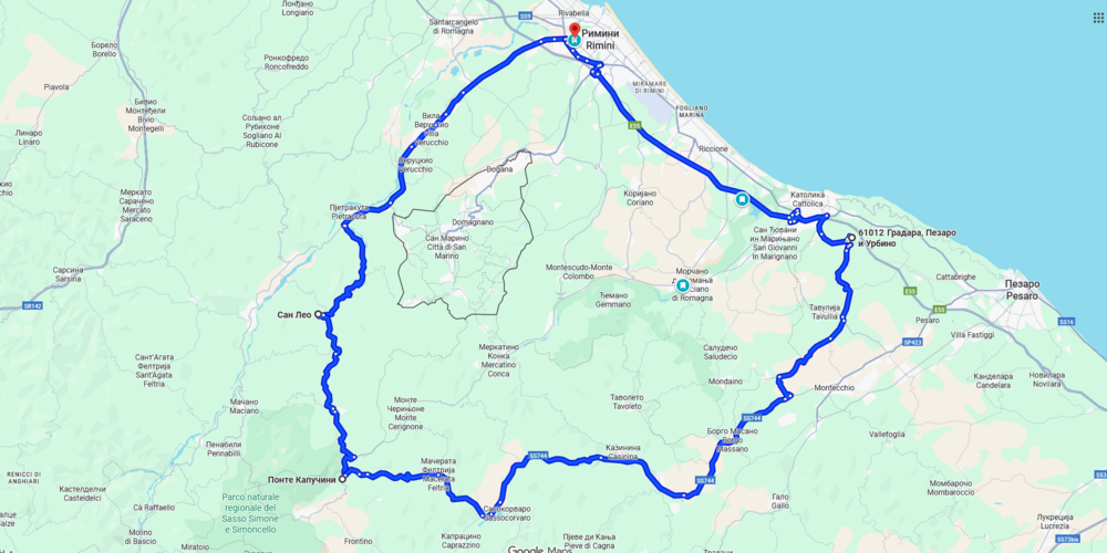 PONEDELJAK 15 sep. - plan za danas red vožnje red šetanja red odmaranja. Planiramo kružnu vožnju oko San Marina. Prvo mesto za pauzu grad na steni San Leo, zatim vozikanje lokalnim putevima do Gradare i poseta starom gradu i tvrđavi. Usput gde nam se svidi stajemo i pauza. San Leo bogat istorijom i prelepim građevinama .