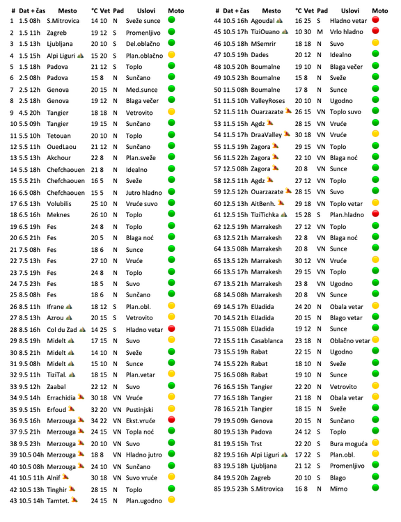 Pozdrav moto drugari! Kako mi je ovo prvo javljanje na forumu ove godine, poželeo bih svima u novoj godini dobro zdravlje i što više bezbednih i sretnih moto kilometara. Spremamo se za moto turu u Maroko, do Djenove pa trajektom do Tanžira. Startujemo 1. maja a vraćamo se 20. Za Maroko imamo 12 celih dana. Biće to ukupno oko 5000km vožnje, od kojih oko 2700 po ovoj divnoj zemlji.. Tempo dnevnih vožnji po Maroku će biti od srednjeg do umerenog. Naredno je detaljniji plan sa rutom i gde se spava. Molim one koji JESU u materiji da prokementarišu, dodaju, oduzmu, napomenu zajebe i-ili nezaobilazna mesta, odnosno šta raditi i gde. Specifične bezbednosne brige nas takodje zanimaju, tipa kome se šta i gde TAČNO desilo…i tako Hvala svima koji odvoje vreme za nas … vraćamo uslugu detaljnim putopisom kada se slegnu svi utisci nakon ove obećavajuće ture Ruta> TRAJEKT noćenje Tangier → Oued Laou → Akchour → Chefchaouen SPAVANJE → Volubilis → Meknes → Fes SPAVANJE X 2→ Ifrane → Azrou → Col du Zad (2178 m) → Midelt SPAVANJE→ Tizi n’Talrhemt (1907 m) → Tunel legionara (Zaabal) → Errachidia → Erfoud → Merzouga (Sahara) SPAVANJE→ Alnif → Tinghir → Todra Gorge (R703) → Tamtetoucht → Agoudal → Tizi n’Ouano (2960 m) → M’Semrir (R704) → Dades Gorges (R704) → Boumalne Dades SPAVANJE → Valley of Roses → Ouarzazate → Agdz (detour) → Dolina Draa (N9/R108) → Zagora SPAVANJE → Agdz → Ouarzazate → Aït Benhaddou → Tizi n’Tichka (2260 m) → Marrakesh SPAVANJE X2→ El Jadida SPAVANJE → Casablanca → Rabat SPAVANJE→ Tangier TRAJEKT Detaljnije> Sever, Mediteran i planine Rif: Trajekt iz Djenove, noćenje TANGIER → OUED LAOU (N16, ~65 km) OUED LAOU → AKCHOUR NP (~40 km, lokalni putevi) AKCHOUR NP → CHEFCHAOUEN (N13/N16, ~60 km) → noćenje u Chefchaouenu CHEFCHAOUEN → VOLUBILIS (N13/N4, ~200 km) VOLUBILIS → MEKNES (N6, ~30 km) MEKNES → FES (N6, ~60 km) → noćenje u Fesu (dve noći) Srednji Atlas i Sahara: FES → IFRANE (N8, ~85 km) IFRANE → AZROU (N8, ~25 km) AZROU → prevoj Col du Zad → MIDELT (N8/N13, ~180 km) → noćenje u Mideltu MIDELT → prevoj Tizi N'Talrhemt → Tunel Legionara → Zaâbal → ERRACHIDIA (N13, ~200 km) ERRACHIDIA → ERFOUD (N13, ~65 km) ERFOUD → MERZOUGA (R702/R702A, ~50 km) → noćenje u Merzougi (Sahara) Sahara, Visoki Atlas, Todra i Dades: MERZOUGA → ALNIF (N17, ~100 km) ALNIF → TINGHIR (N113, ~100 km) TINGHIR → TODRA GORGE (R703/RN12, ~20 km) TODRA GORGE → TAMTETOUCHT → AGOUDAL → prevoj Tizi N’Ouano 2.960 m → M’SEMRIR → DADES GORGES → BOUMALNE DADES (R703/R704/N10, ukupno ~120 km) → noćenje u Boumalne Dades Visoki Atlas i Draa dolina: BOUMALNE DADES → ROSES VALLEY → OUARZAZATE (R704/N10, ~100 km) OUARZAZATE → detour: AGDZ → DOLINA DRAA → ZAGORA → AGDZ (N9/R108, ~150 km) → ZAGORA, noćenje u Zagori ZAGORA → AGDZ → OUARZAZATE → AÏT BENHADDOU (N9/R108, ~60 km) AÏT BENHADDOU → PREVOJ TIZI N’TICHKA 2100m → MARRAKEŠ (N9, ~200 km) → noćenje u Marakešu (dve noći) Atlantska obala i povratak u Tangier: MARRAKEŠ → EL JADIDA (N9/N1, ~320 km) noćenje El Jadida EL JADIDA → CASABLANCA (N1, ~110 km) CASABLANCA → RABAT (A1/N1, ~90 km) → noćenje u Rabatu RABAT → TANGIER (A1/N1, ~330 km) → završetak ture TRAJEKT za Djenovu.