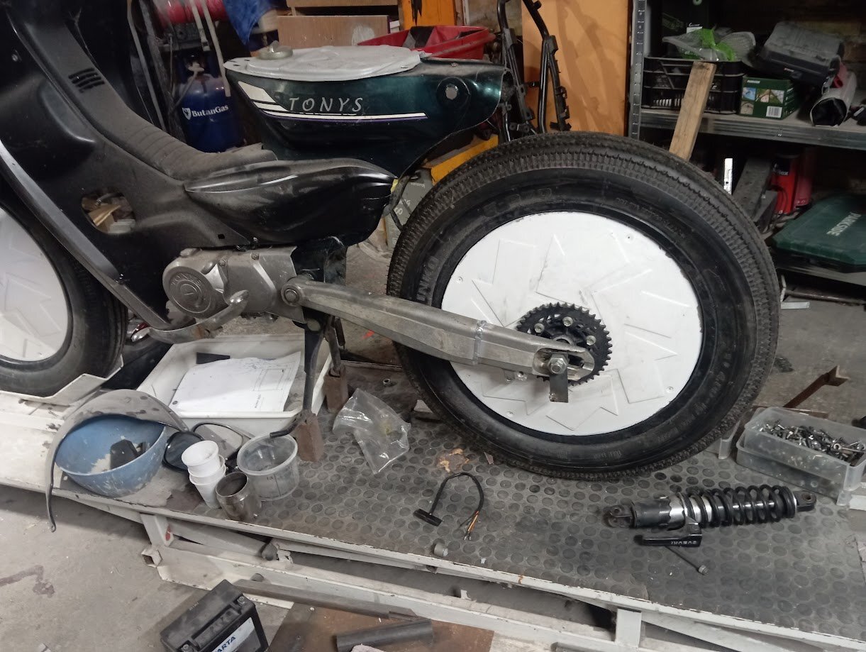 Дуга пауза. Ваљда ћу га завршити у овој инкарнацији, да не морам да се враћам. Гума је неки Харли, фелна емзејац 250, задња главчина Томос. Кочница је од Дукатија 748. Таква је била и на неким КТМ моторима. Скен, цртеж, па проба на 3Д принту, корекција и на крају ласер. Срце диска је изрезано од аламини, а диск од котловског челика. Нитне правим на стругу.