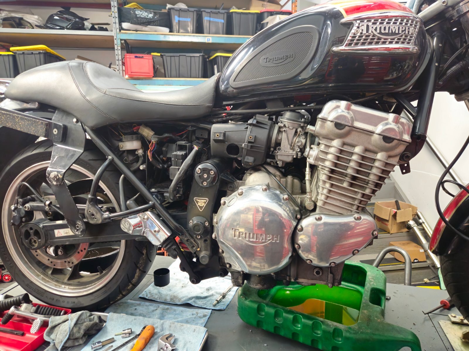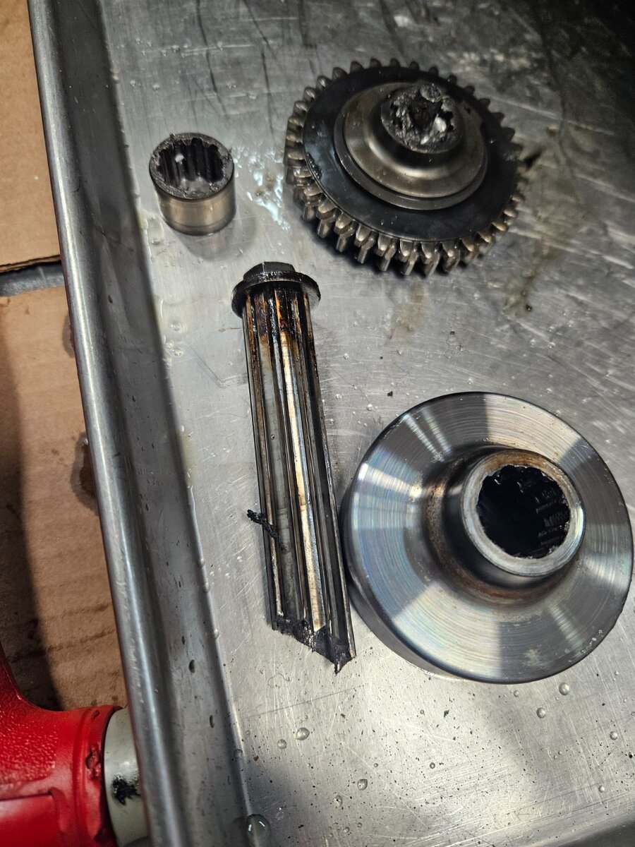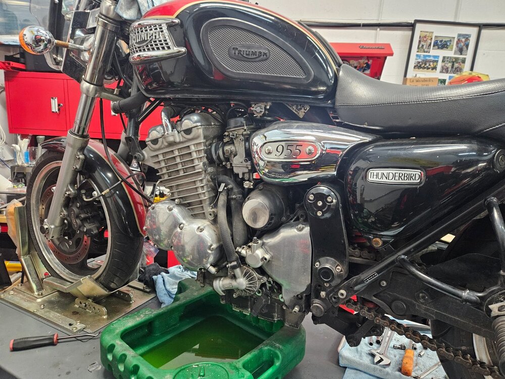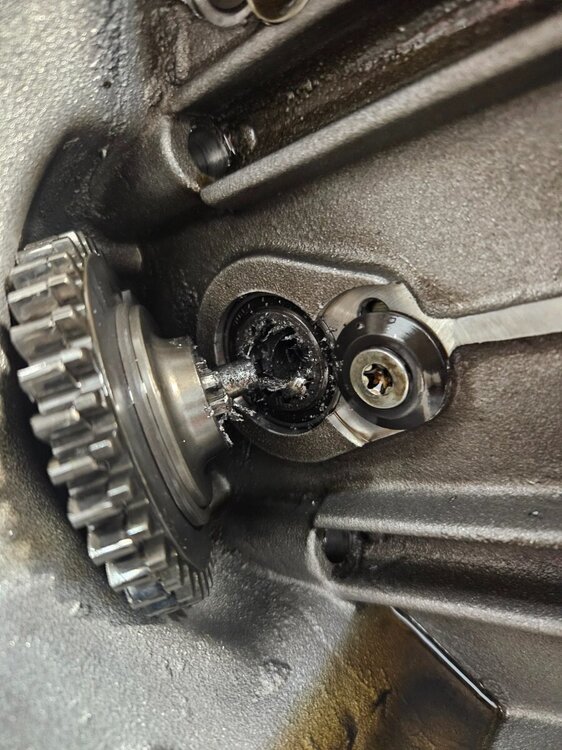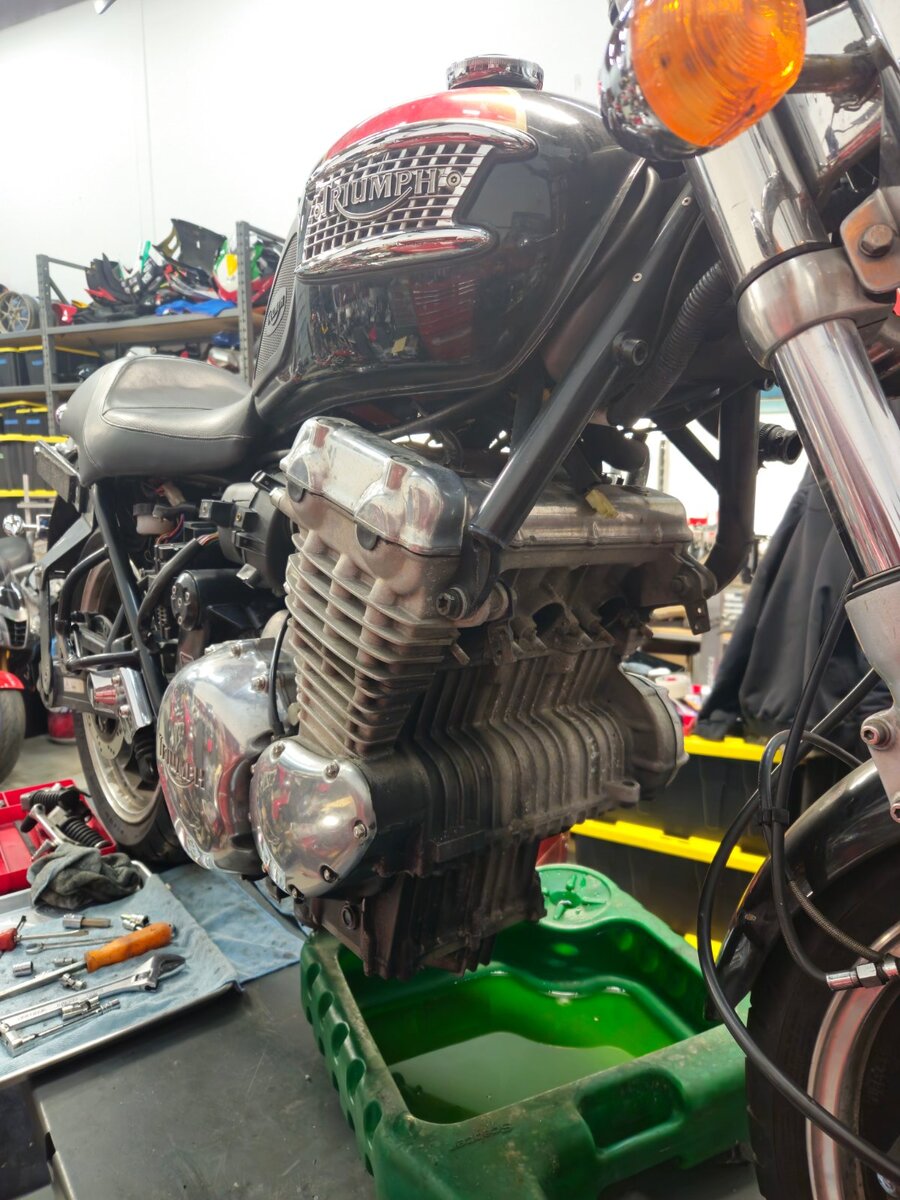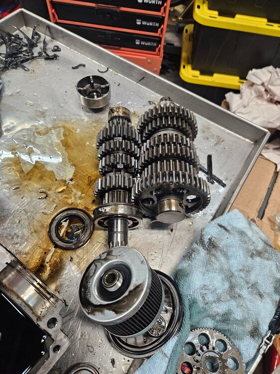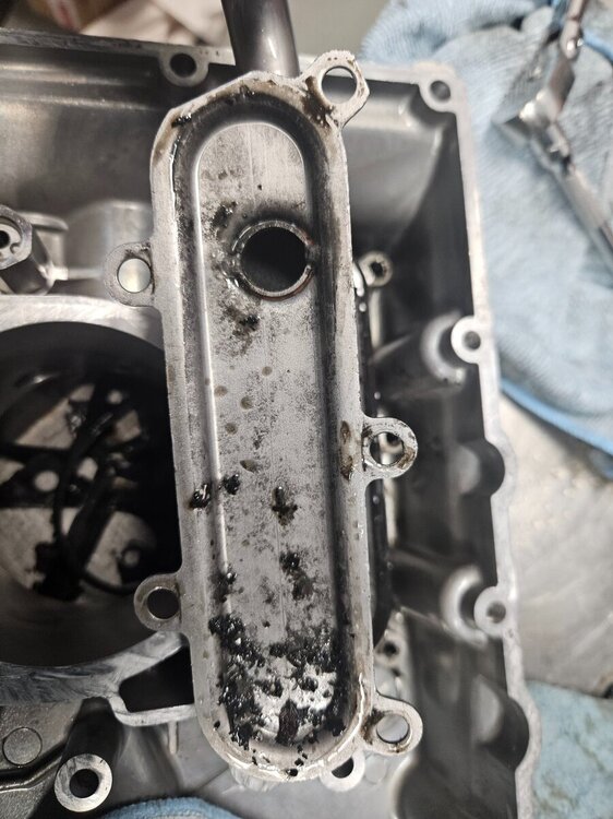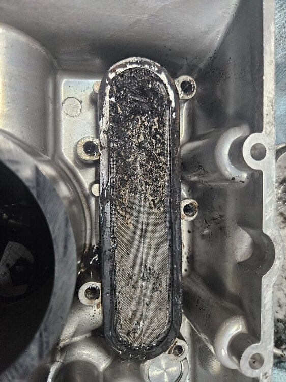 Ко ме је натерао да прихватим овај посао... ваљда носталгија или што познајем власника и власника (прог ) пре њега. Интересантна прича о овом мотору. Први власник је помало крупан и 900 кубика му није било доста, па је одлучио да разбуши агрегат на 955 кубика. Тих година кад је то радио није нико могао да му направи нови дихтунг главе који ће да паше на веће клипове ( кад боље размислим можда је и била нека опција, али познавајући овог то му било скупо ). Колко сам ја упућен он је обрадио клипове ту изнад прве карике да буду мањег пречника и тако искористио дихтунг главе од 900 кубика. Од мене је тражио различите брегасте, јер је знао да увек нешто имам у штеку . Које су на крају завшиле у агрегату нисам сигран или оне из Т595 или оне из 955и. Мотор је склопио и возио га тако, никада нисам сазнао како је подесио карбураторе и предпаљење. Предпостављам да је користио кутију за паљење од неког другог модела, а карбуратори би требали да су лаки за подешавање. Е сад је мотор дошао је код мене, јер није могао да упали, као отишло је квачило анасера. На моју жалост квачило анасера је добро, али је осовина која покрече алтенатор пукла... колико знам тај део није више у производњи. Још морам да пребацим мењач са пет на шест брзина ( оригинални кит још из 1995 ). Као што видите сито за уљну пумпу скоро па пуно свега. Још је оригинални власик користио ону течну заптивну масу и све се то скорило. Чистим два дана и још није како треба.