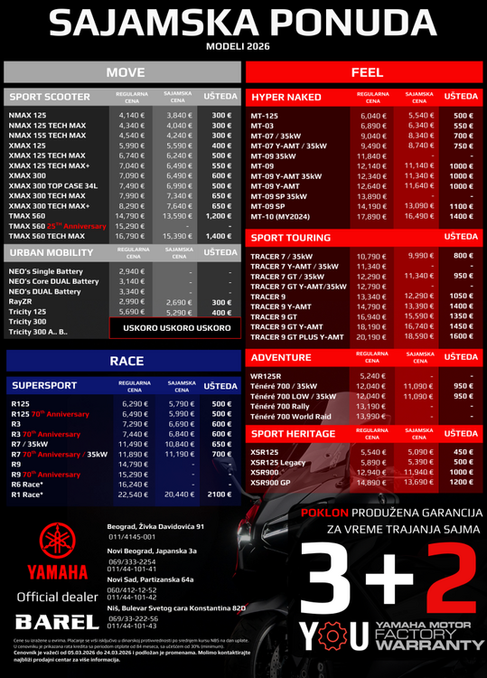 Nije tema za Yamahu, ali u Tracer temama se nahvatala paučina pa evo cena za sajam: Tracer 7 300e popust, 7GT 500e, 9 700e... Yamaha Barel Srbija (@yamahabarelsrbija) • Instagram photos and videos WWW.INSTAGRAM.COM 156 likes, 6 comments - yamahabarelsrbija on February 27, 2026: "Modeli motocikala 2025 sada po sniženim cenama! Iskoristi priliku da voziš novu Yamahu uz specijalne...