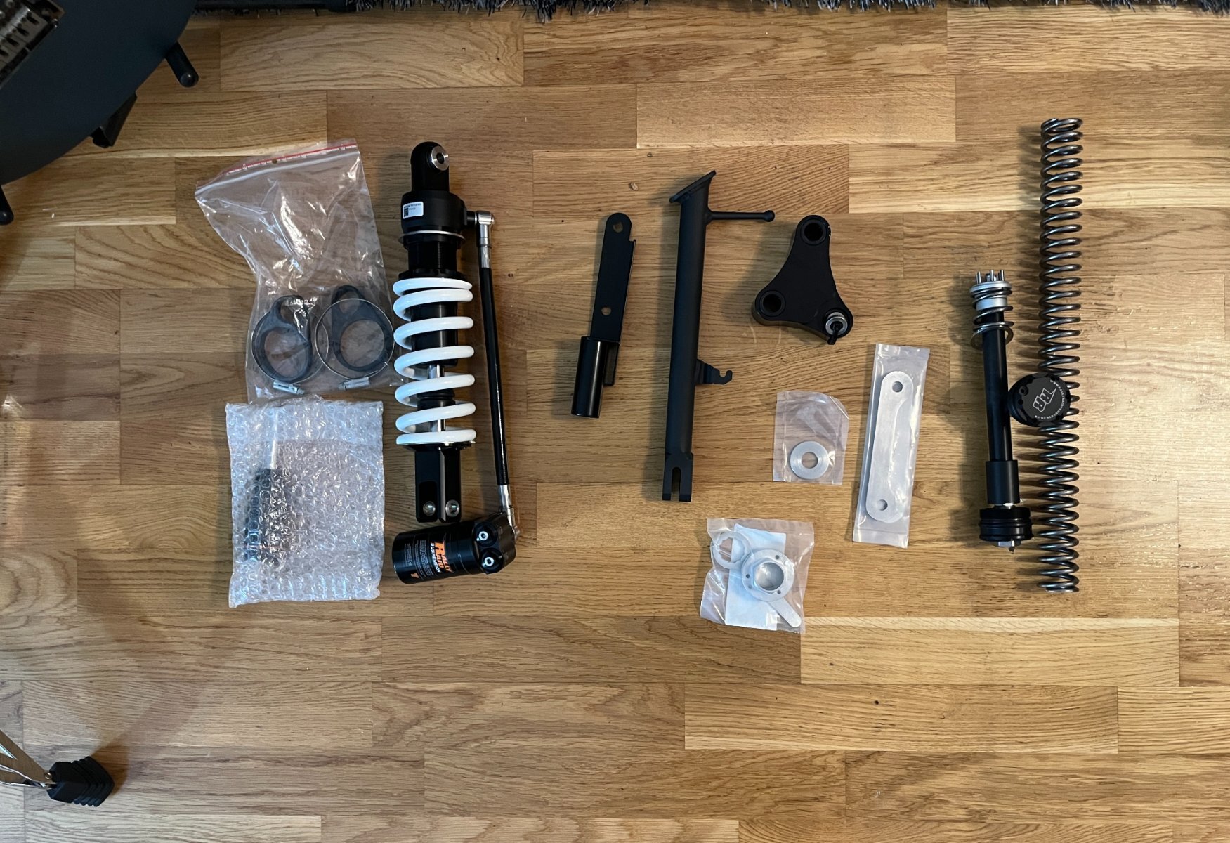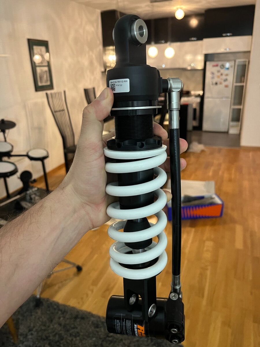 Ugradio Rally Raid level 2. Pa evo prvi utisci dok je sveze naspram fabrickog. Momentalno jako lep osecaj. Bolje nego sto sam ocekivao. I po putu i van puta je super, ne znam gde je primetnije unapredjenje. Najvise sam se plasio da nije pretvrdo, i da nestane fabricki komfor (jer sam kratko probao drugov RR2, ne znam koja je podesavanja imao ali delovalo tvrdje). Ali ovo je bolje u svakom pogledu. I komfor, stabilnost, kako motor skrece, kako prebacuje masu pod punim gasom, na kocenju... Nekako je direktnije i bas precizno, a udobno. Odlicna kontrola. Opruge sam uzeo naspram svoje tezine, prednju (7.2 N/mm) i zadnju (110 N/mm) za (90-105Kg) standard. Namestio sam u startu naudobnije setovanje (bez preload-a, ni napred ni nazad, tj samo pola kruga da uhvati navoj). I merio sam "sag" i ispada idealan 30% bez prtljaga. 170mm travel, Sag oko 50-51mm, i static sag oko 15mm samo motor (8-9%). Fakticki idealno po uputstvu, tacno gde treba da je hod kada sednem. Kada budem dodavao prtljag jos 10-15tak kg, to je i dalje u ok opsegu do nekih 60mm. Tako da jednom namestio i verovatno vise ne diram. Izmerio sam clearance, sam motor, ravno kada stoji oko 210mm na najnizem delu (cak +30mm vise od fabrickog, verovatno jer motor manje tone od svoje tezine). Tako da je bas dobro, plus efektivno clearance mnogo bolji u voznji od same cifre, jer je linearna opruga napred sada, i postepeno i kontrolisaniji hod vesanja. Daleko je teze nabiti vile do kraja i na jacem skoku. Kada sam provozao poznatim off terenom i rupama, uzivanje. Gde sam pre usporavao i rasterecivao vile, sada proletim bez drame. I prednji i zadnji tocak prate podlogu i kod vecih rupa, prepreka. Kao zalepljeni. Nema cekanja da se smiri zadnji kraj, nemam jakog udara. Odmah nastavi dalje i drzi podlogu. Takodje wheelie kontrola je direktnija i laksa. Ne znam koliko se na slici vidi nesto, ali stav je malo drugaciji, visi je motor na oko. Svidja mi se. Tako da to je to, posle dosta kilometara (nekih 60K) imao sam osecaj da sam iz fabrickog vesanja izvukao maksimum. Sada sam dobio jos sposobniji i bolji motor, i polako se navikavam ponovo. Ima prostora za napredak i jos dinamicniju/zabavniju voznju. Mislim da retko koji motor moze fabricki da ima ovako dobro upravljanje, pogotovo taj TracTive zadnji amortizer kako se ponasa, rekao bih vredi u nekom momentu uloziti tih 1.2K. (ili malo manje za level 1)