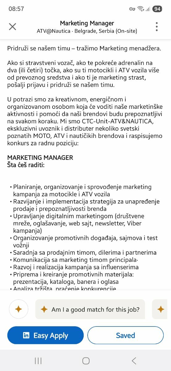markommarko 694 Napisano Septembar 30 Svrati ponekad, 312 postova Lokacija: Beograd Motocikl: Honda NX 500 Prijavi odgovor kao problematičan Dobio sam ovaj oglas na linkdinu, pa ukoliko nekoga zanima, izvolite i prijavite se: ATV@Nautica hiring Marketing Manager in Belgrade, Serbia | LinkedIn WWW.LINKEDIN.COM Posted 8:36:50 AM. Pridruži se našem timu – tražimo Marketing menadžera.Ako si stravstveni... Citat Podeli ovaj odgovor sa prijateljima Link to post Share on other sites More sharing options...