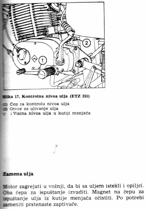 drumskalisica 8741 Napisano Jun 12, 2008 Ne silazi, 5900 postova Lokacija: Novi Sad - Cacak, Srbija Motocikl: Suzuki GS 400, Sacsh Madas 125, Piaggio Zip, Tomos Targa, Honda NX 650 Dominator Prijavi odgovor kao problematičan Sto se tice kolicine ulja, sipa se 0,9 l u ETZ-a 250/251. ako nece da procuri na kontrolni otvor sa strane, upalis motor, pustis da malo radi i prebaci visak ulja iz srednjeg dela bloka u bocni i onda opet proveris i to je to . Sto se menjaca kod ETZ-a 125 i 150 tice, oni su identicni, ALI ( uvek mora da bude neko ALI ) motori proizvedeni do 1986 godine su imali deblje viljuske ( oko 3,5 mm ), i klizni zupcanici u tim motorima su imali sire kanale za te viljuske . Posle 1986 godine isti modeli su imali tanje viljuske ( oko 3,2mm ) , a i njihovi zupcanici su imali uze kanale. Trgovci to ne znaju, a ko radi menjac nek uzme subler u ruke, premeri svoj menjac, pa sa sublerom u nabavku. Ove mere sam dao onako iz glave, a tacno su napisane u MZ manual 125/150 . Srecan rad ! Citat Podeli ovaj odgovor sa prijateljima Link to post Share on other sites More sharing options...